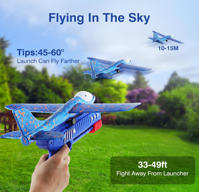 This airplane launcher toy comes with a high-performance launcher gun. With just a simple press, the plane soars into the sky. By adjusting the launch angle (45°–60°), it can fly higher and farther, reaching distances of 10–15 meters, giving kids the ultimate “fly into the sky” experience.