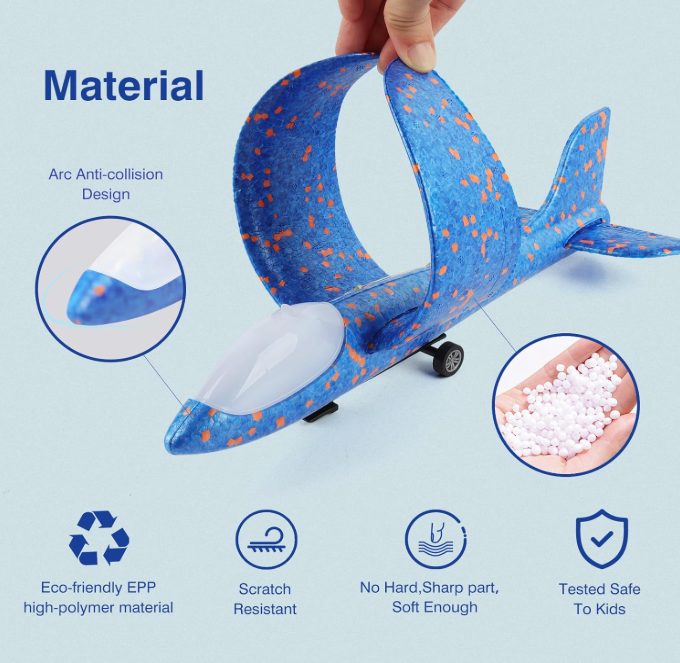 The airplane is made from eco-friendly EPP high-polymer material, which is lightweight, durable, and crash-resistant. Its scratch-resistant surface, soft structure, and lack of hard or sharp parts ensure maximum safety. Tested and certified, it is perfectly safe for children to play with, allowing them to have fun while parents stay worry-free.
