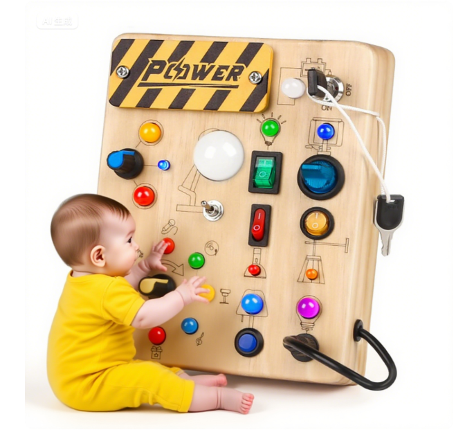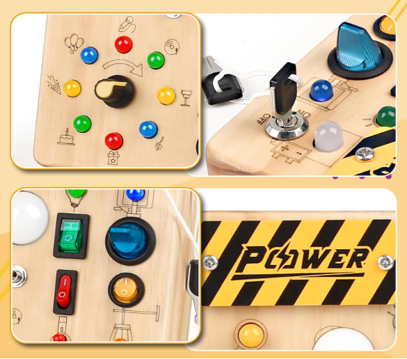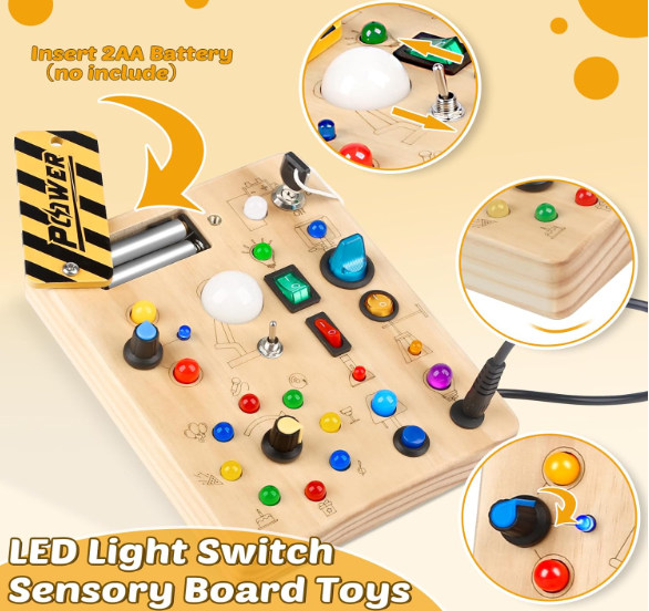 - [LED Busy Board for Toddlers ] The wooden activity board includes 19 colorful LED and 10 Switch Light Designs and requires 2 AAA batteries to support work (No included). Encourage toddlers early learn daily electrical knowledge and life skills development.